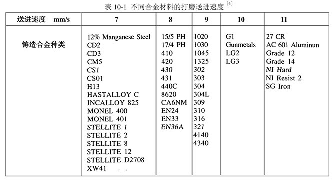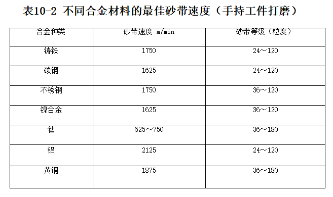 l 砂帶的速度 砂帶速度直接影響打磨速度、表面粗糙度和打磨過程中產(chǎn)生的熱量。一般來說, 砂帶速度快打磨速度也快,工件表面粗糙度細(xì),但過高的砂帶速度會(huì)使工件發(fā)熱。軟的金屬,如鋁和黃銅等,可以采用較高的砂帶速度。打 磨 鈦合金要求不能產(chǎn)生過多熱量,建議將砂帶速度降低到625m/min。表10-2 列出了在手持工