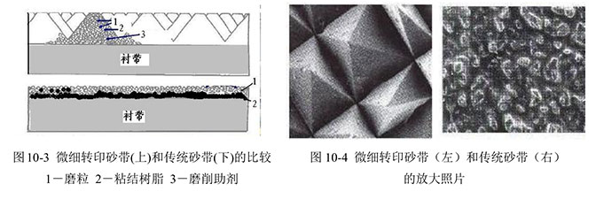 粒在砂帶上的粘結(jié)強(qiáng)度和磨削助劑(通常是潤滑劑)也有重要作用。圖 10-2 所示就是帶有和不帶磨削助劑時(shí)打磨效果的對(duì)比。1990 年 3M - Abrasive Systems 公司率先推出并獲得專利的一項(xiàng)制作砂帶的新技術(shù)——微細(xì)轉(zhuǎn)印 (Microreplication)法問世。與傳統(tǒng)砂帶不同,它不是將磨粒直接粘附在人造纖維編織襯帶上(圖 10-3 下和圖 10-4 右) [2],而是在襯帶表面轉(zhuǎn)印上具有預(yù)