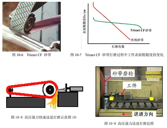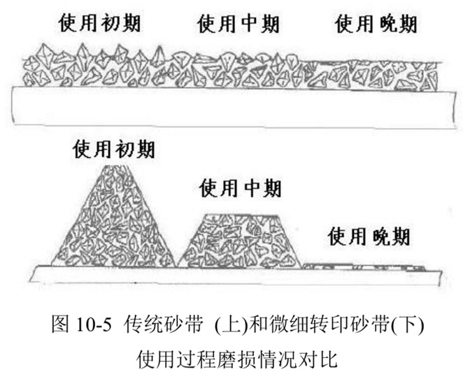 CF 砂帶。其上的 Microreplication 研磨塊厚而耐用,比傳統(tǒng)砂帶裝載的磨粒多 2~3 倍,使用壽命長 2 倍,而且,工件經(jīng)打磨后的表面粗糙度始終保持均勻(見圖 10-7)。