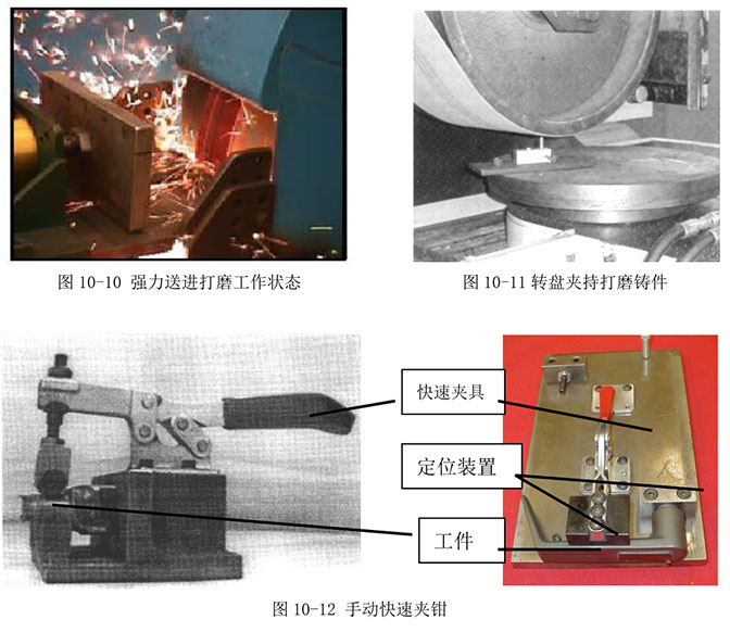 打磨時(shí)工件裝卡夾持可采用專門設(shè)計(jì)的手動(dòng)快速夾鉗(圖 10-12)[5],也可采用轉(zhuǎn)盤或機(jī)械手等多種方式(見圖 10-11、圖 10-13 和圖 10-14)[8、13]。